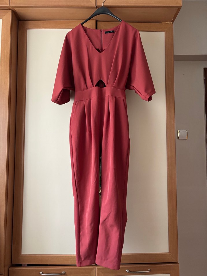 Gül kurusu renkte, V yakalı ve salaş kesim tulum. İpek gibi dokusu ve drapeli detaylarıyla normcore tarzında, günlük kullanıma uygun.