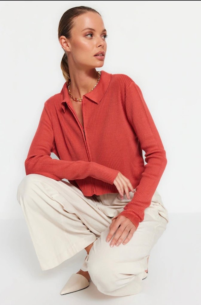 Gül Kurusu Fermuarlı Triko Crop Hırka