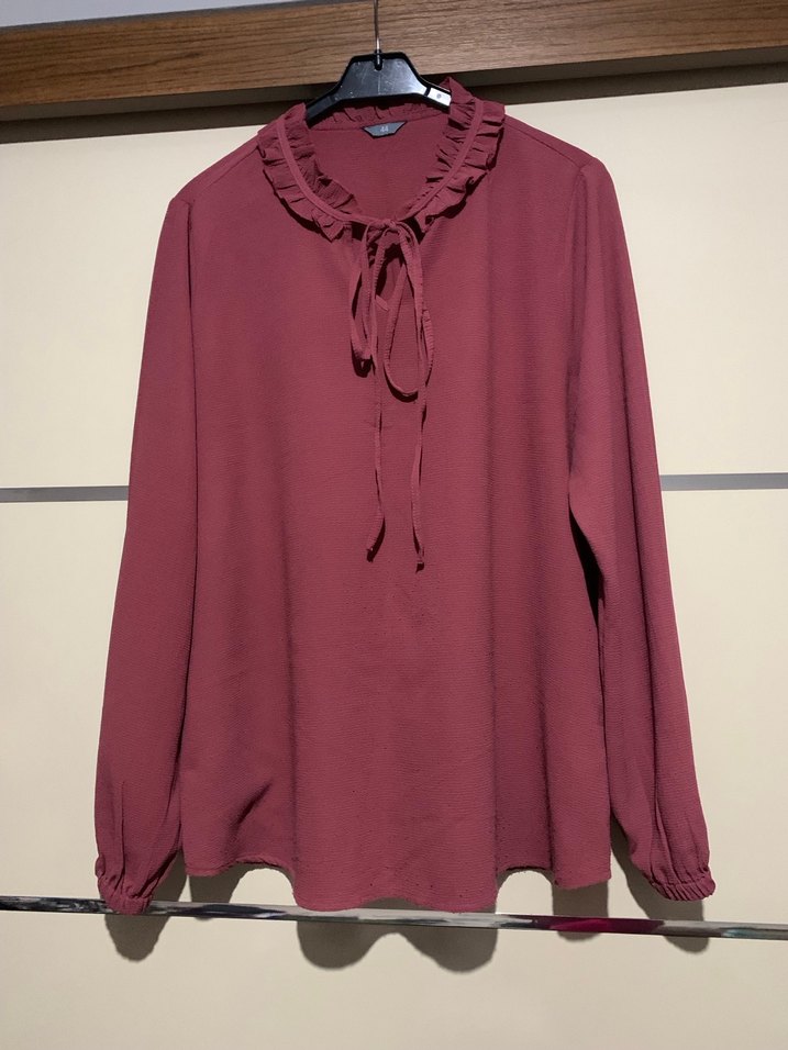 Gül kurusu renkte, fırfırlı yakalı, uzun kollu ve salaş kesim olan bu bluz, yumuşak sentetik kumaştan üretilmiştir ve günlük rahat stil için uygundur. Birkaç kez giyildi ve bir sıkıntısı yoktur