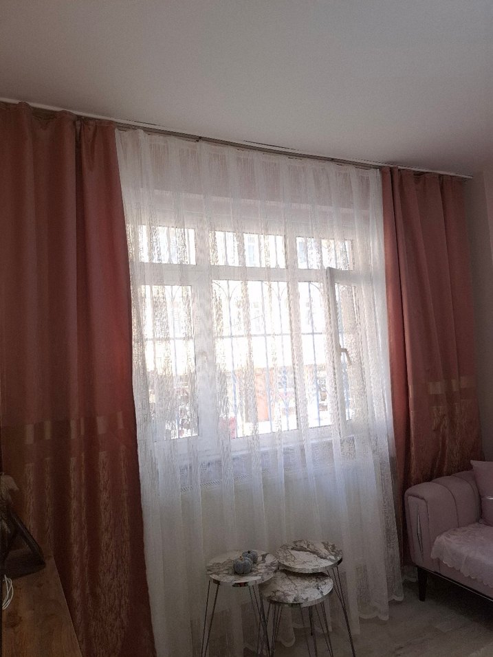 Açık bej renkli, düz desenli konvansiyonel tül perde, doğal ışığın yumuşakça geçmesini sağlar.