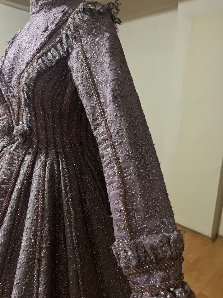 Gül kurusu işlemeli, drapeli, uzun kollu, yüksek yakalı ve bol kesim kadın gelinliği, gotik tarzda özel bir seçimdir. İpi yok