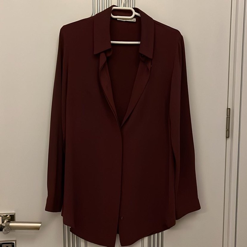 Gül kurusu renkli, uzun kollu kadın gömleği, kesik yaka ve düğmeli ön detaylarına sahiptir. Normal boyda, ipeksi dokulu ve minimalist tarzda, ofis kullanımı için uygundur.