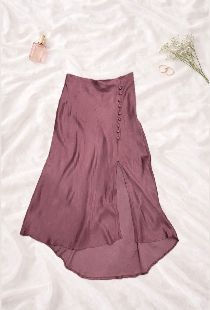 Bordo renkli, saten kumaştan, düğme detaylı uzun etek. Parlak yüzeyli ve düğme detaylı, romantik akşamlar için ideal.