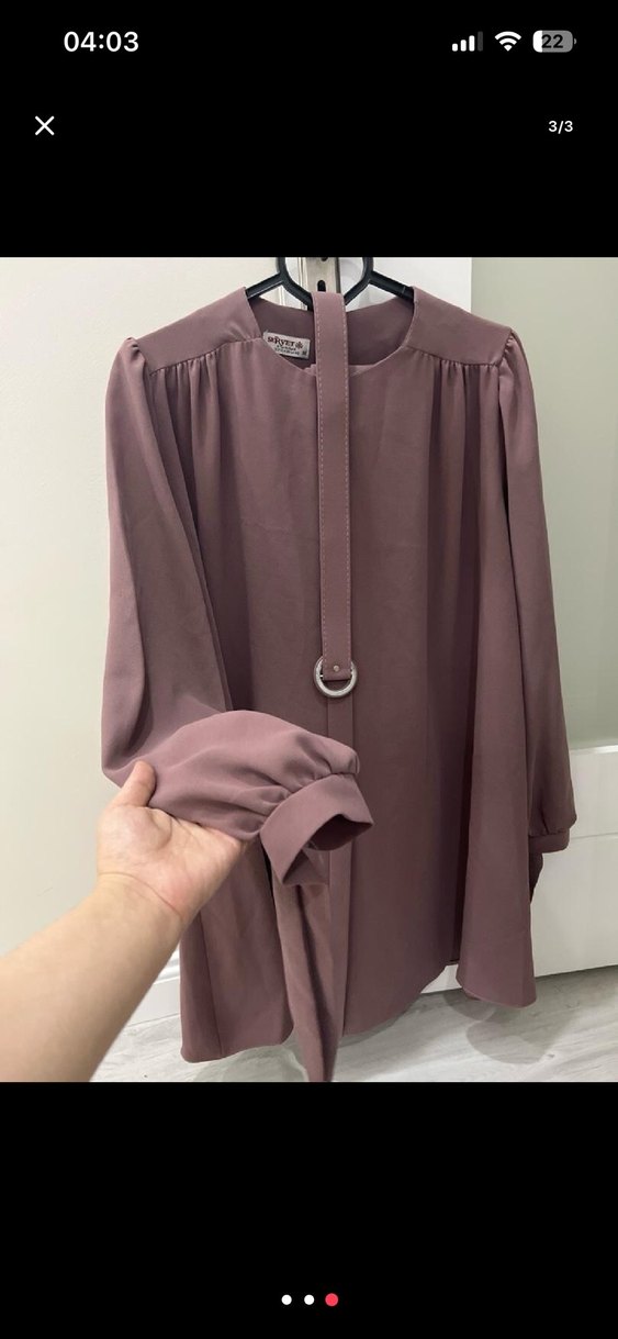 Bej renkte, yüksek yakalı ve uzun kollu midi tunik. Kemer detaylı, bol kesim ve ipeksi dokulu, günlük sokak giyim tarzına uygun.
