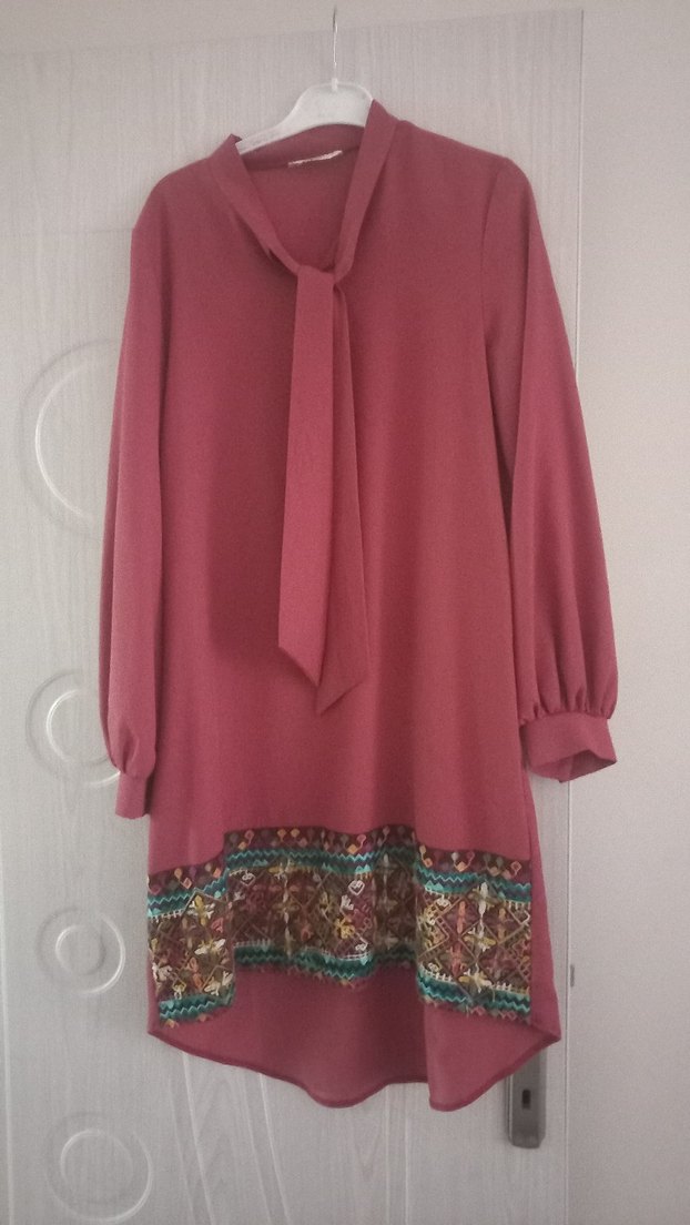 Gül kurusu renkte, bol kesim uzun kollu, yüksek yakalı, drapeli ve etek kısmında nakışlı bohem tunik. Yumuşak sentetik kumaştan üretilmiştir.