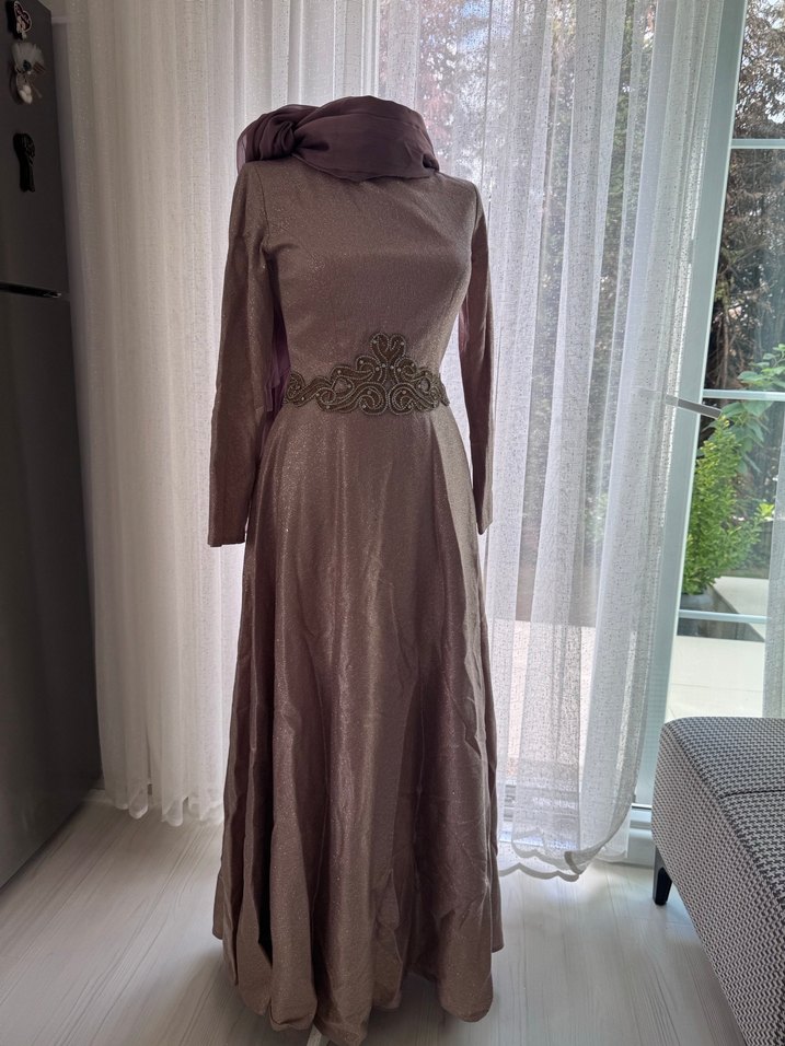 Gül kurusu renkli, uzun kollu ve drapeli bu abiye elbise, tekdüze parlak kumaştan ve tek parça halinde, tekne yakalıdır. Bel kısmında zarif bir detay bulunur.