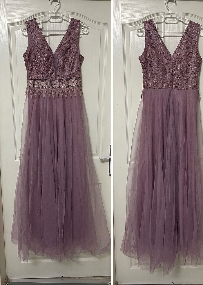 1 kere düğünde giyildi. Hiçbir kusuru yoktur. Artık bedeni olamayacağı için satıyorum. Yoksa böyle abiyeleri uyguna bulmak zor artık :( Son fotoğraflarda üstümde duruşunu görebilirsiniz. Boyum 1.60 Gögüs kısmı ve belde transparan kısımlar Var