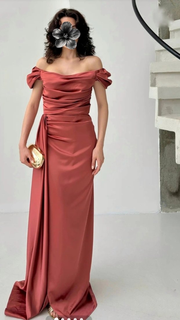 Gül kurusu renkli, drapeli detaylara sahip, uzun ve vücuda oturan abiye elbise. Kayık yaka ve ince askılıdır, parlak yüzeye sahiptir.