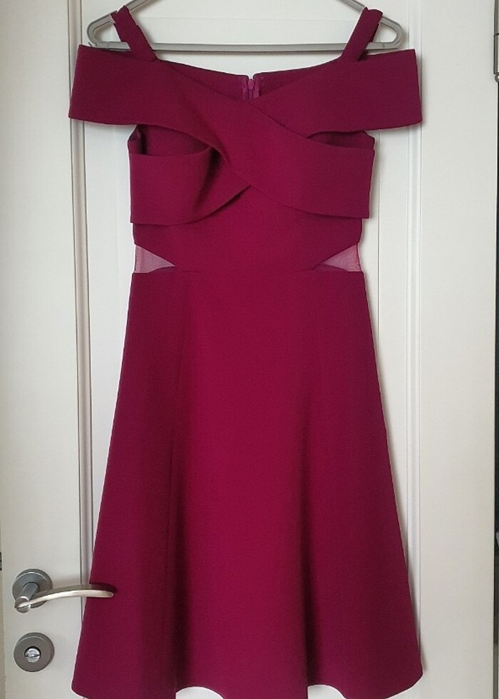 Belden, sag ve sol tarafta seffaf tul var. Prenses yaka gibi, yakasi cok acik degil, lastik askilar var omuzdan, isterseniz cikarilabilir. Belden asagisi bol iniyor ve diz altinda bitiyor. Hem rahat, hem ozel gunlerde de giyilebilecek, şık bir elbise