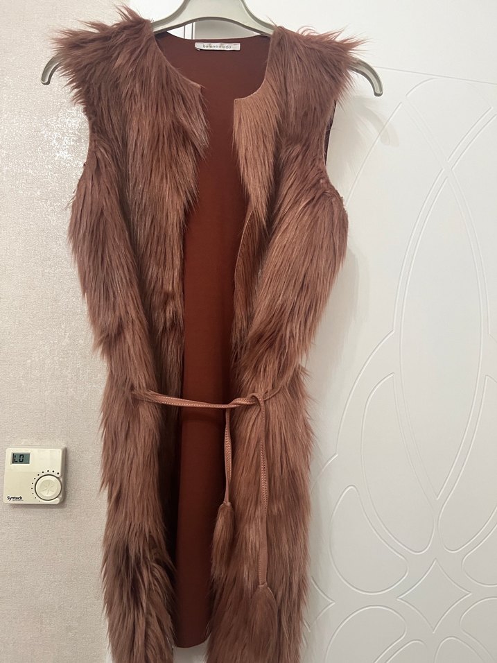 Kahverengi süet kumaştan, kürklü detaylı, uzun ve vücuda oturan kadın yelek. Kolsuz ve halter yakalı, bohem tarzda rahat bir model.