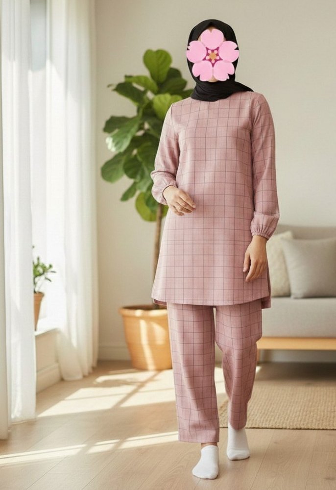 Pembe kareli kadın takım, yüksek yakalı ve uzun kolludur. Normal kesim ve midi boyda, yumuşak sentetik kumaştan günlük kullanıma uygundur. Minimalist tasarımıyla zahmetsiz şıklık sunar.