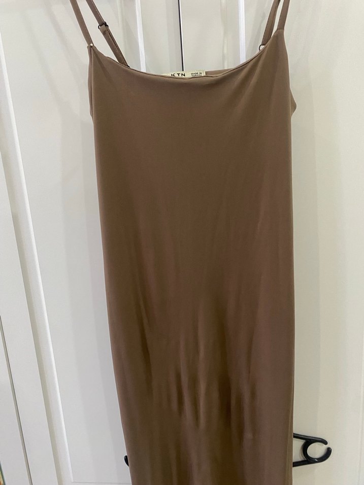 Gül kurusu uzun, ince askılı ve saten dokulu bu elbise, minimal ve rahat şıklık sunar. Sadece askısının biri kopuk tamir ederek gönderim sağlıyorum sadece 2 saat kadar giyildi