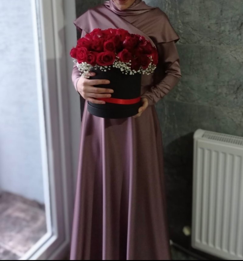 Gül kurusu renkli, drapeli ve uzun kollu, vücuda oturan kesime sahip kadın elbisesi. İpek gibi dokusu, yuvarlak yaka ve hafif çiçek desenli. Düğün ve gotik tarz için uygun.