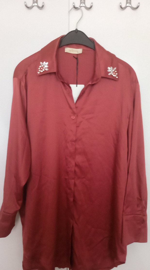 gül kurusu renkli, saten uzun kollu, yakası nakışlı ve düğmeli kadın gömlek. Rahat kesim, ipeksi ve parlak kumaştan, midi boyda günlük kullanıma uygun.