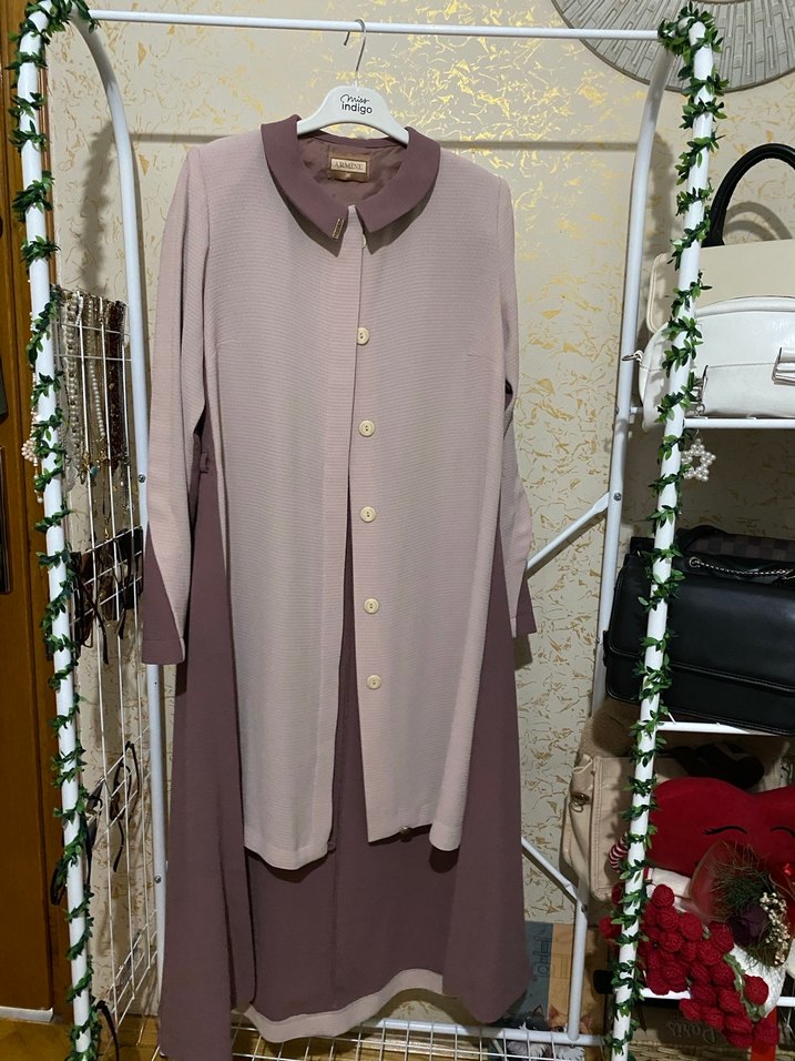 Uzun boy, gül kurusu tonlarında, düğmeli ve yakalı kadın ferace. Sentetik kumaştan, rahat kesimli ve günlük kullanım için uygun. Herhangi bir defosu hasarı yoktur.