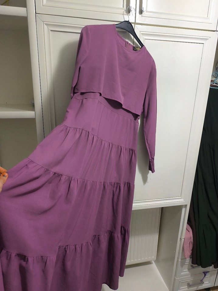 gül kurusu, uzun ve salaş kesim elbise. Drapeli tasarımı, yuvarlak yaka ve uzun kolludur. Yumuşak kumaştan yapılmıştır. 42 beden yeni