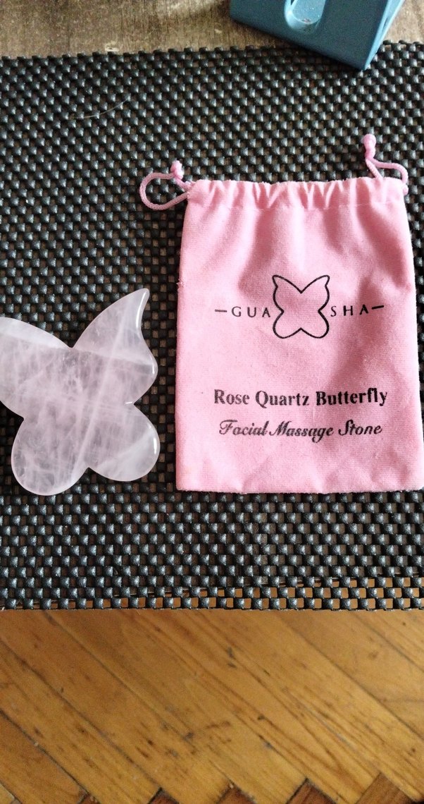 Gül kuvars kelebek şekilli yüz masaj taşı, yumuşak kese ile birlikte. Yüz masajı ve rahatlama için kullanılır.