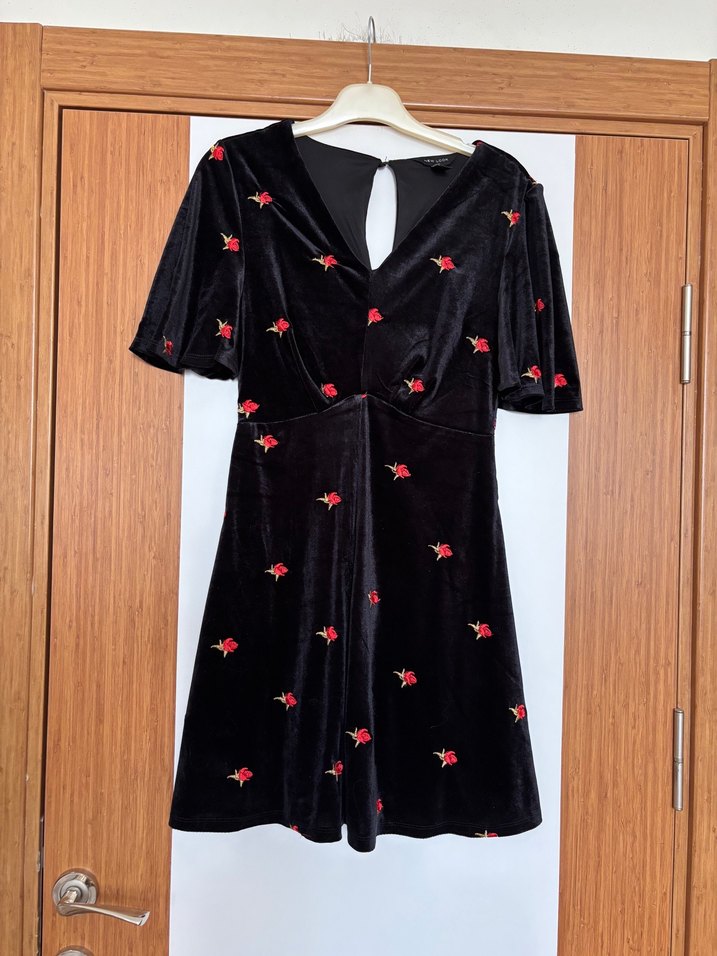 Gül Nakışlı Siyah Mendil Kol V Yaka Süet Elbise