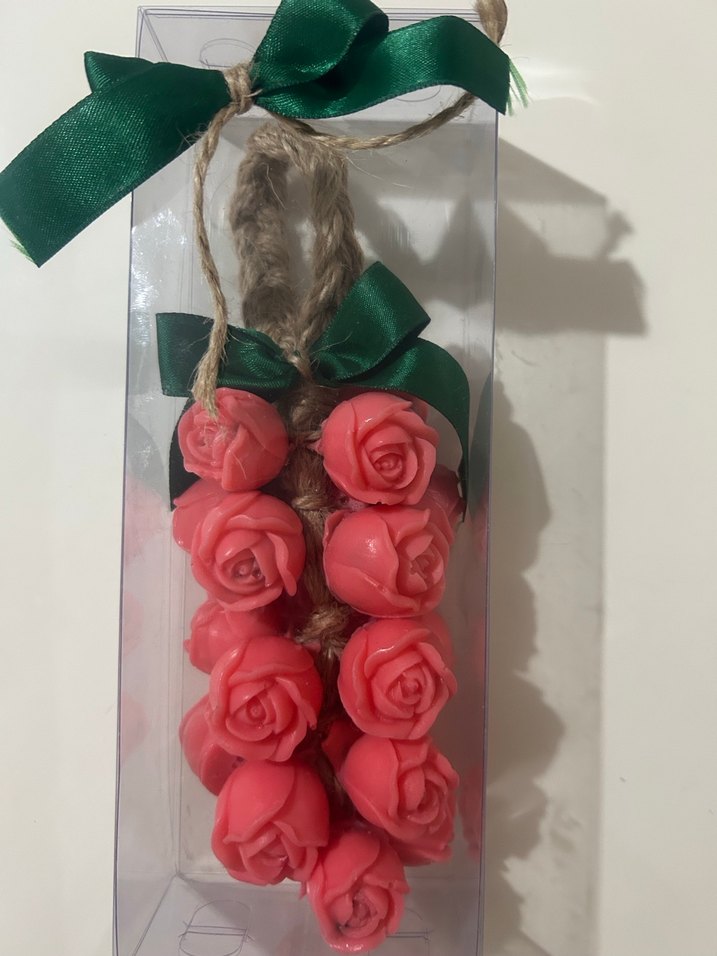 Pembe gül şekilli dekoratif sabun seti, yeşil kurdele ve doğal ip ile bağlanmıştır. Banyonuzda çiçeksi bir dokunuş sağlar.