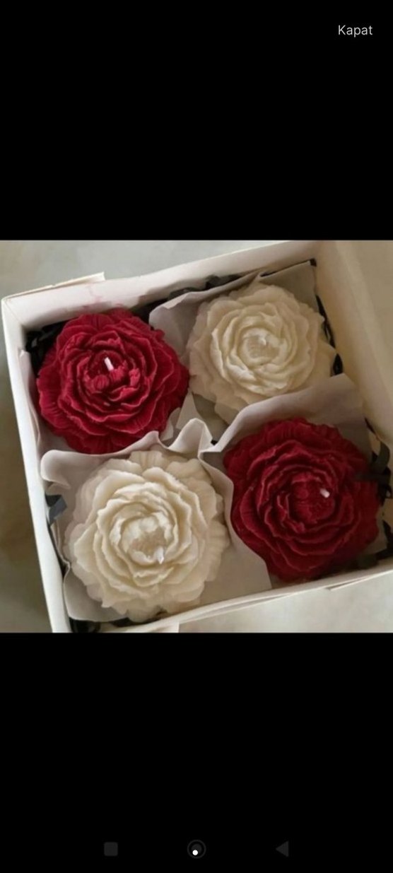 Beyaz ve kırmızı renklerde, gül şeklinde dört adet mumdan oluşan set. Dekoratif amaçlı kullanılabilir.