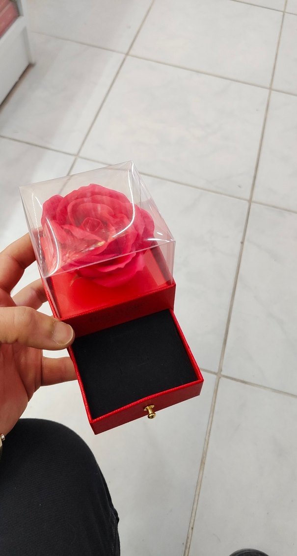 Şeffaf kapaklı, gül şeklinde kırmızı parfüm kutusu, küçük çekmeceli.
