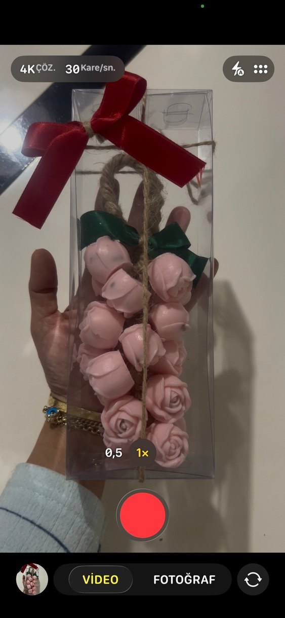Pembe gül şeklinde dekoratif sabunlar, yeşil kurdele ile bağlanmış ve kırmızı fiyonkla paketlenmiş. Hediye veya dekorasyon için uygun.