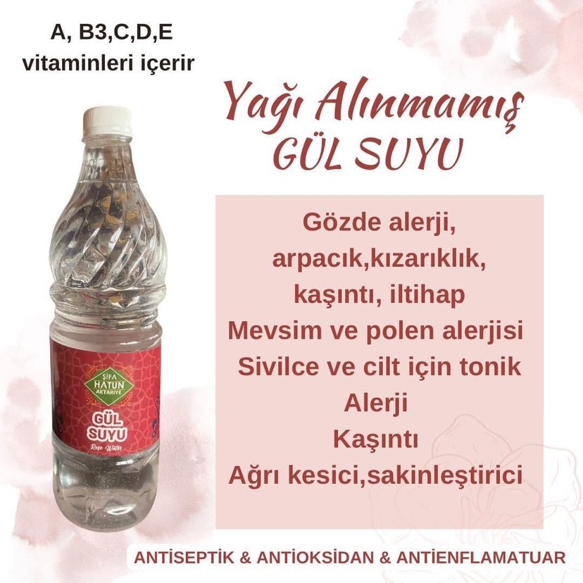 Şifa hatun yağı alınmamış gül suyu,hem cilt için,hem öksürük,baş ağrısında içim olarak kullanılan doğal gül suyu..içindeki yağ oranını fotoğraflarda görebilirsiniz.1 litre fiyatıdır