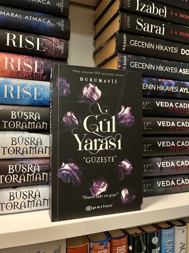 Durumaytı'nın "Gül Yarası" romanı, mor güllerle süslenmiş koyu kapaklı, yoğun aşk ve duygusal derinlik temalarını işleyen bir eser.