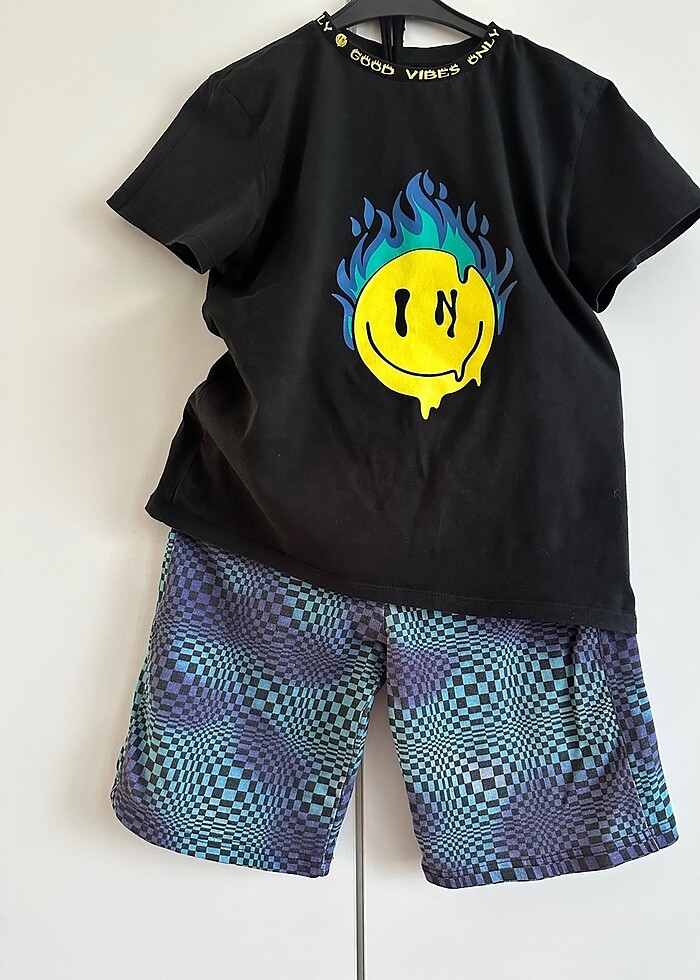 Nebbatin Marka erkek çocuk alt üst takım. Çok şık ve yazlık Şort Bel ölçüsü 32 cm, bel ağ arası uzunluğu 32 cm ve belden boyu 48 cm. Tişört iki kol arası 48 cm, boyu 51 cm