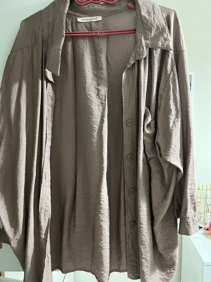Bej gri tonlarda, keten kumaştan, düğmeli ve uzun kollu kadın gömleği. Salaş kesimli, notched yaka ve midi boyda, minimalist bohem tarzda günlük kullanıma uygun.standart beden