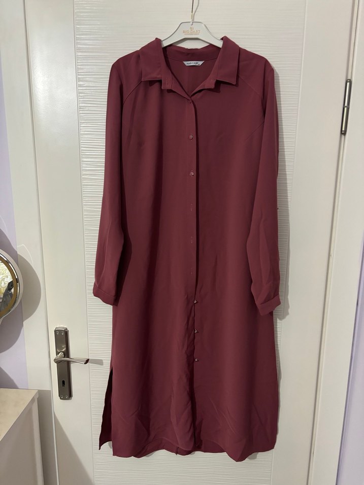 Bordo renkli, düğmeli ve yakalı uzun kadın tunik. Rahat kesimi ve uzun kollarıyla günlük kullanıma uygundur.
