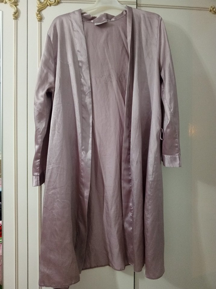 Gül kurusu renkte, uzun kollu ve bol kesim kadın sabahlık. Minimalist ve desen içermeyen sade tasarım.