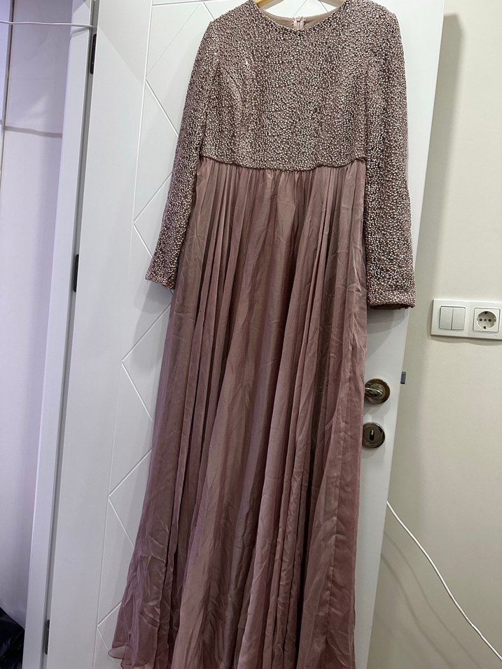 Gülkurusu renkli, uzun kollu, salaş kesim abiye elbise. Üst kısmı dokulu, etek kısmı akıcı kumaştan olup, minimal ve klasik bir şıklık sunar. Düğünler için uygundur.