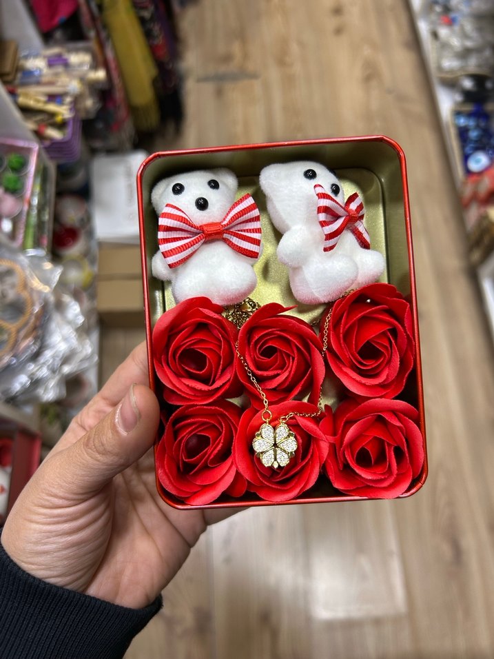 Kutu içinde canlı kırmızı yapay güller, çizgili kırmızı fiyonk takmış iki küçük beyaz ayıcık ve taşlı altın renkli çiçek kolye bulunur.