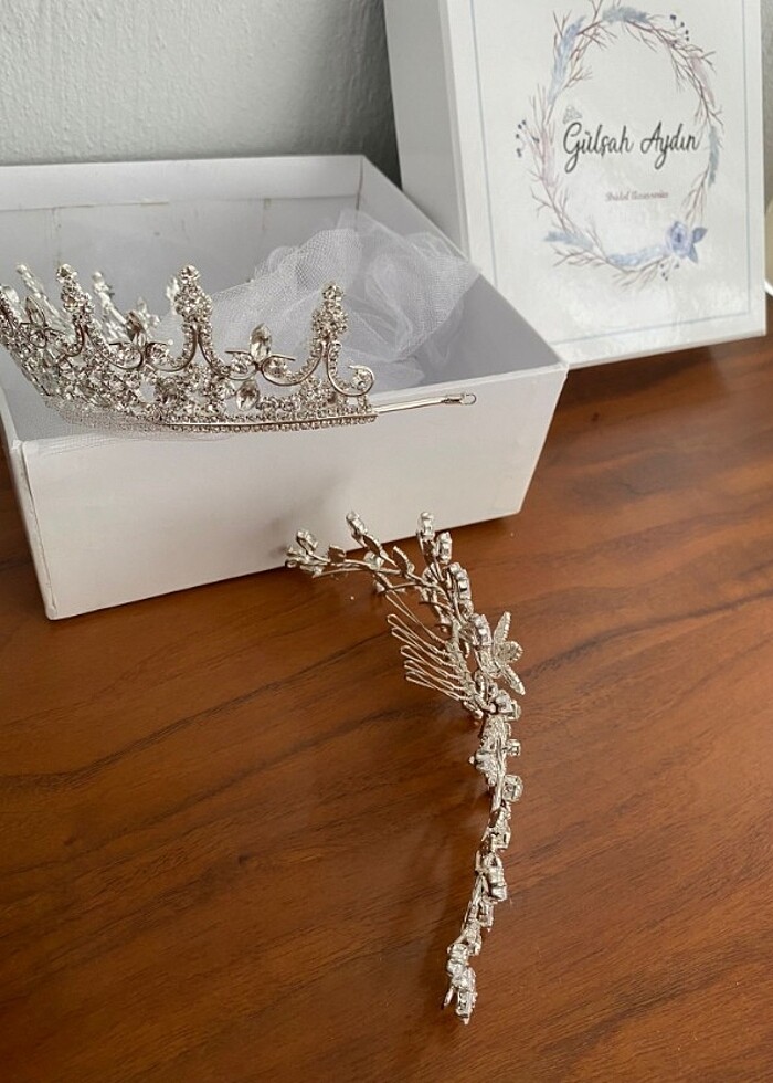 Ünlü Gülşah aydın marka, gelinlik taç ve tokası. Taş düşmesi yok, eğilme yok. Kutusunda, sadece 1 kez kullanıldı. Sıfır gibi duruyor. Ayrı ilanda tokayı sattım. Sıfır fiyatlarına sitesine girip bakabilirsiniz Google üzerinden kendi adı ile. Makul tuttum fiyatı, nakit ihtiyacından satıyorum. İ z mr i çi e ldn te slm o lr.
