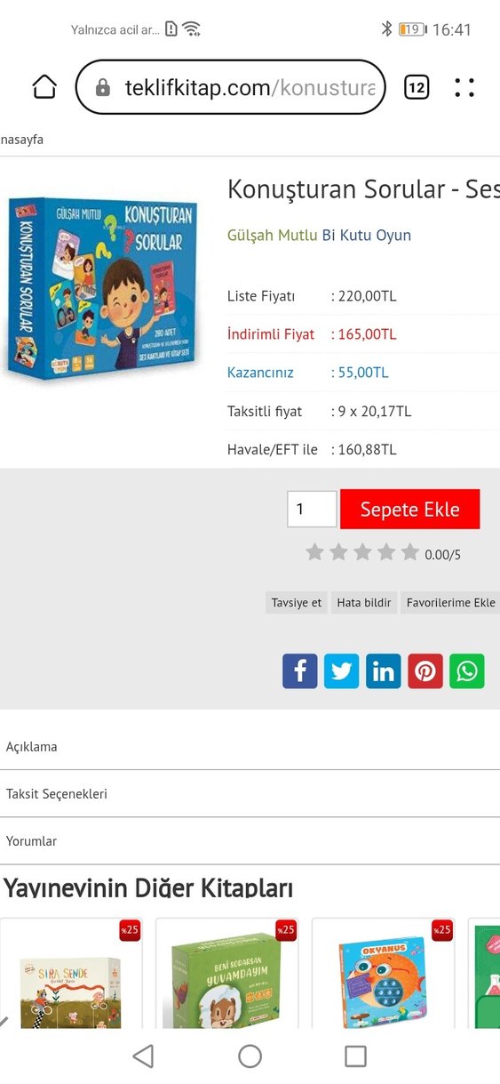 Gülşah Mutlu'nun hazırladığı, çocukların konuşma ve öğrenme becerilerini geliştiren etkileşimli soru kartları içeren oyun seti. Kitabın sayfalarında karalamalar var ama Kullanıma engel değil