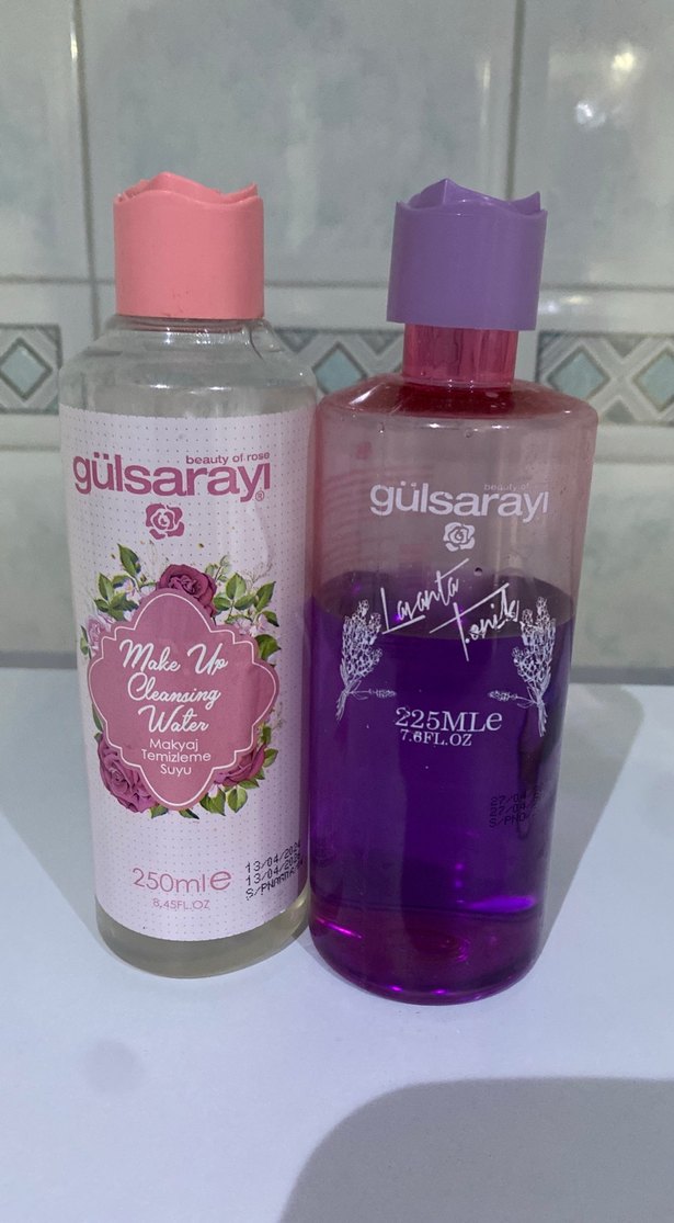 Gülsaray markasına ait 250ml makyaj temizleme suyu ve 225ml lavanta kokulu yüz temizleyici. Cildi nazikçe temizler ve makyajı arındırır.