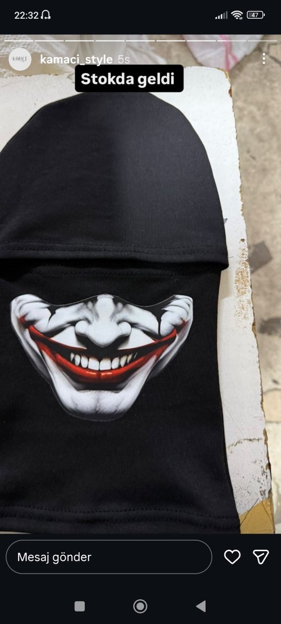 Erkekler için siyah maske, üzerinde gülümseyen Joker yüzü deseni bulunur.