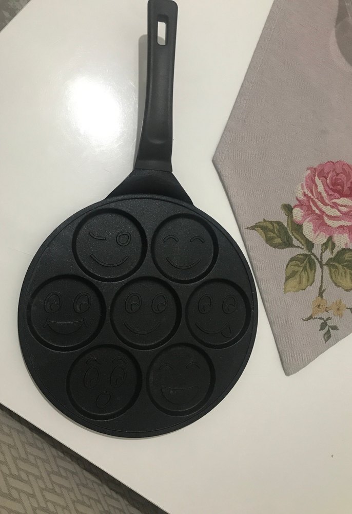 Yedi gülümseyen yüz şeklinde kalıbı olan siyah tava, eğlenceli krep veya atıştırmalıklar için uygundur.