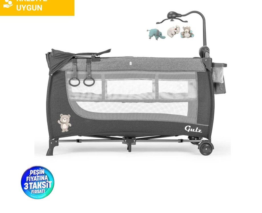 Gulz gri oyun parkı beşiği, görünürlük ve hava akışı için file yanlara, yumuşak yatağa ve oyuncaklı mobile sahiptir. Halkalar ve tekerlekler kolay kullanım sağlar. yatağı gönderilmeyecektir.