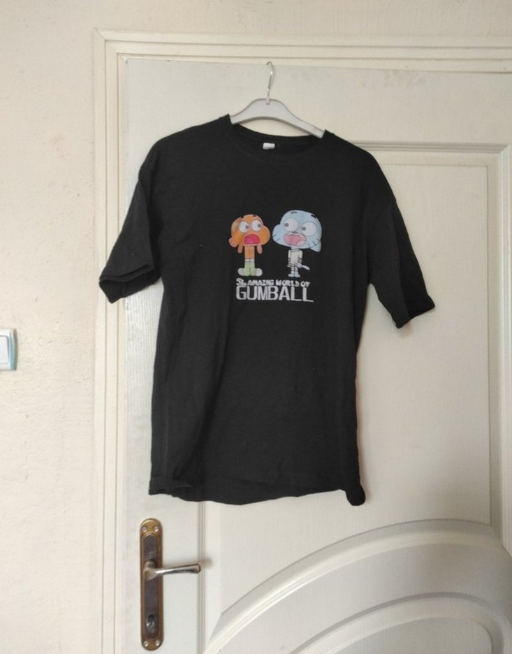 Pamuklu, kısa kollu ve kabarık kollu gri kız tişörtü. Bol kesim ve bisiklet yaka, The Amazing World of Gumball baskılı desen içerir.