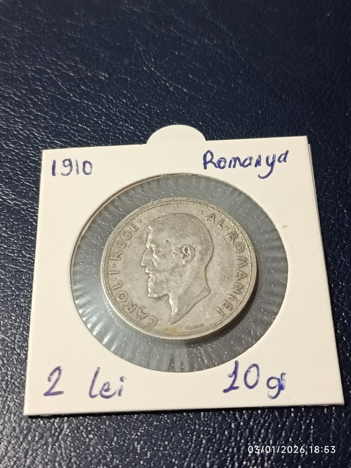 1910 tarihli, 10 gram ağırlığında, Kral Carol I profilinin yer aldığı Romanya 2 Lei gümüş madeni para. Koruyucu kılıfta, elle yazılmış bilgilerle.