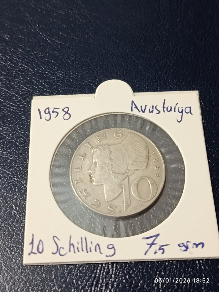 1958 yılına ait, 7.5 gram ağırlığında, vintage tasarımlı Avusturya 10 Schilling gümüş madeni para.