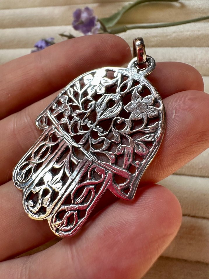 , üzeri çiçek ve yaprak desenleriyle işlenmiş Fatma el figürlü kolye, günlük kullanıma uygundur.