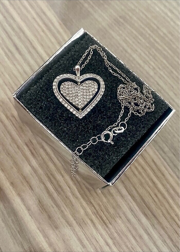Çift yönlü-GÜMÜŞ KOLYE- KALPLİ TAŞ DETAYLI(taşları düşmez ve kararma yapmaz) Gösterişli çok şık bir üründür Üzerindeki ismi silebilen takıcılar var