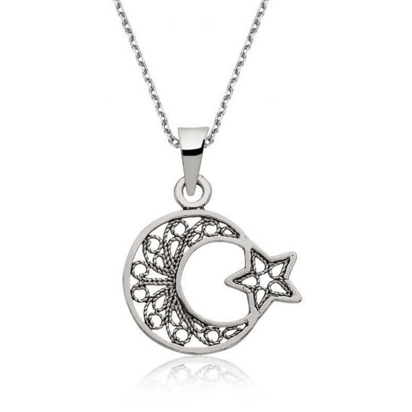 Bu şık kolye 925 ayar gümüşten imal edilmiştir. Gümüş üzerine rodyum kaplama yapılmıştır. Rodyum kaplama yapılan tüm gümüş bayan kolyeler parlaklığını uzun süre muhafaza eder. Kolyenin 45 cm uzunluğunda gümüş zinciri vardır. Tüm gümüş bayan kolye modellerinde olduğu gibi gümüş ay yıldız bayan kolye de el emeği ile üretilmiştir. Gümüş ve değerli taşlar nedeniyle belirtilen ortalama ürün ağırlığında ± %10 sapma olabilmektedir. En: 1.90 cm Boy: 1.60 cm Ort. Ağırlık: 3.00 gr.