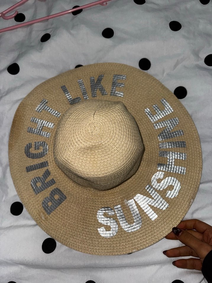 Pullu 'BRIGHT LIKE SUNSHINE' yazılı, sentetik kumaştan geniş kenarlı bej kadın şapkasıdır. Bohem tarzına uygundur. ☀️