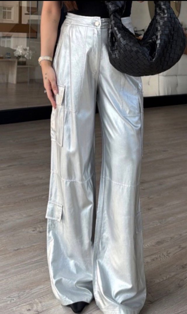 Gümüş Bol Kesim Kargo Kadın Pantolon Sokak stili için uygun, yan cepleri bulunur ✨
