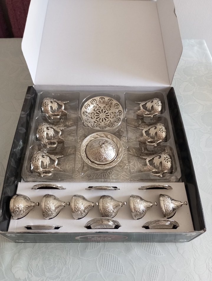 12 parçadan oluşan bu çay seti, gümüş desenli cam bardaklar ve uyumlu tabaklardan oluşmaktadır.
