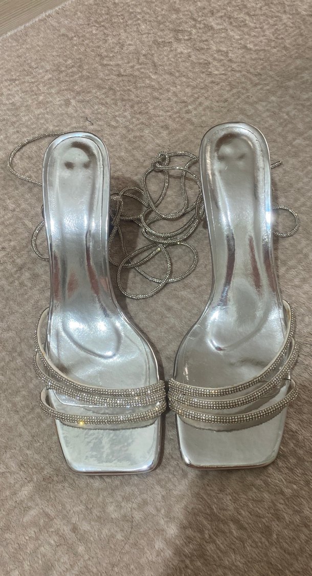 Gri desenli, gümüş taşlı malzemeden yapılmış bantlara sahip stiletto topuklu kadın ayakkabısı. Düğünler için çağdaş tarzda.